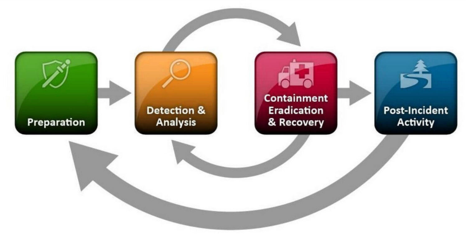 Un estándar importante para verificar su plan de respuesta a incidentes proviene de una publicación del NIST llamada Guía de manejo de incidentes de seguridad informática (SP 800-61). La guía detalla cuatro fases de respuesta a incidentes: Preparación; Detección y Análisis; Contención, Erradicación y Recuperación; y Actividad posterior al Incidente.